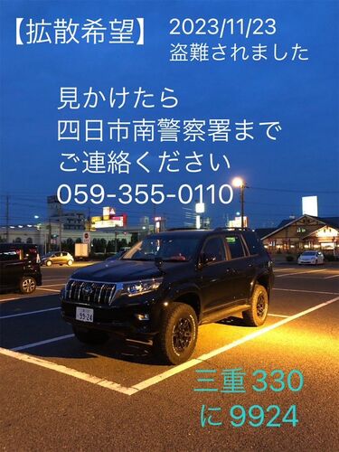 拡散のほどよろしくお願いいたします。 ■車両情報 車種 トヨタ ランドクルーザープラド ボディカラー 黒 ナンバー 三重 330 に 9924 ※付け替えられている可能性もあります 特徴 ・赤いシート ・リフトアップしている ・マフラーが両脇2本出し ■被害日時 2023…