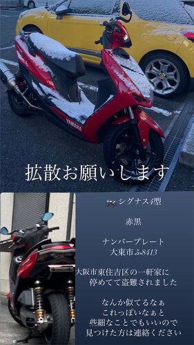拡散のほどよろしくお願いいたします。 ■車両情報 車種 ヤマハ シグナス ボディカラー 赤 ナンバー 大東市 ふ 8413 ※付け替えられている可能性もあります 特徴 ■被害日時 2024年4月20日 ■盗難場所 大阪府大阪市東住吉区 ■連絡先 ・情報元Xアカウント ・ 東住…