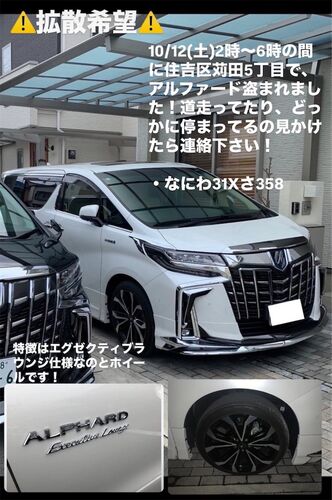 拡散のほどよろしくお願いいたします。 ■車両情報 車種 トヨタ アルファード30系 ボディカラー 白 ナンバー なにわ 31X さ ・358 ※付け替えられている可能性もあります 特徴 ・エグゼクティブラウンジ仕様 ■被害日時 2024年10月12日 ■盗難場所 大阪府大阪市…