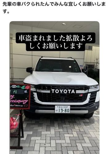 拡散のほどよろしくお願いいたします。 ■車両情報 車種 トヨタ ランドクルーザー300 ボディカラー 白 ナンバー 成田 352 ゆ ・・11 ※付け替えられている可能性もあります 特徴 ■被害日時 2025年12月19日 ■盗難場所 千葉県成田市 ■連絡先 ・情報元Xアカウント…