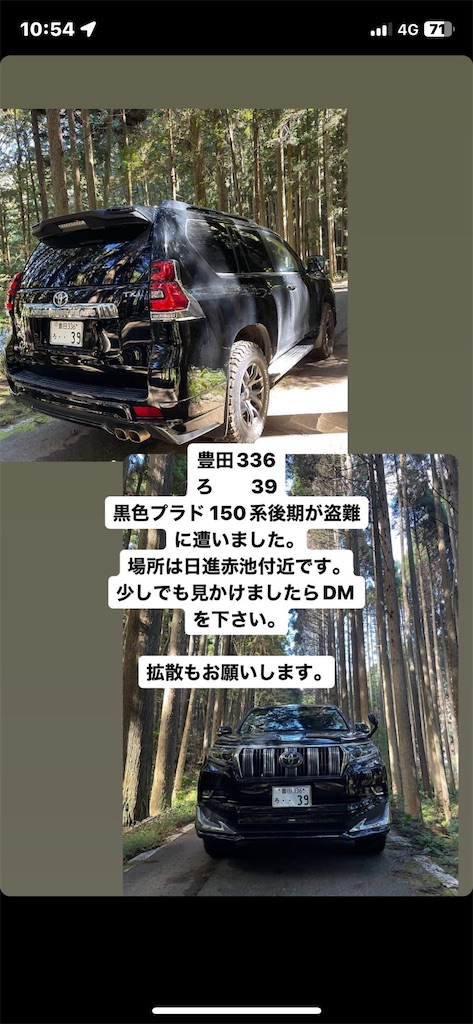 2023-11-20 トヨタ ランドクルーザープラドの盗難です。 盗難情報 自動車 拡散のほどよろしくお願いいたします。 ■車両情報 車種 トヨタ ランドクルーザープラド ボディカラー 黒 ナンバー 豊田 336 ろ ・・39 ※付け替えられている可能性もあります 特徴 ■被害日時 2023年11月20日 ■盗難場所 愛知県日進市 ■連絡先 ・情報元Xアカウント ・愛知警察署 愛知県愛知郡東郷町白鳥2丁目1-8 TEL:0561-39-0110 ※窃盗団もSNSを活用しています。車両の発見や手掛かりは、上記の連絡先に直接していただき、SNSなどでは情報を発信しないようにお願いいたします。