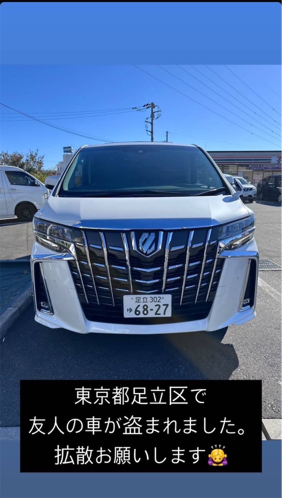 2024-12-01 トヨタ アルファードの盗難です。 盗難情報 自動車 拡散のほどよろしくお願いいたします。 ■車両情報 車種 トヨタ アルファード30系 ボディカラー 白 ナンバー 足立 302 ゆ 6827 ※付け替えられている可能性もあります 特徴 ■被害日時 2024年11月30日 ■盗難場所 東京都足立区 ■連絡先 ・情報元Xアカウント https://x.com/@riomwam ・千住警察署 東京都足立区千住1丁目38-1 TEL:03-3879-0110 ※窃盗団もSNSを活用しています。車両の発見や手掛かりは、上記の連絡先に直接していただき、SNSなどでは情報を発信しないようにお願いいたします。